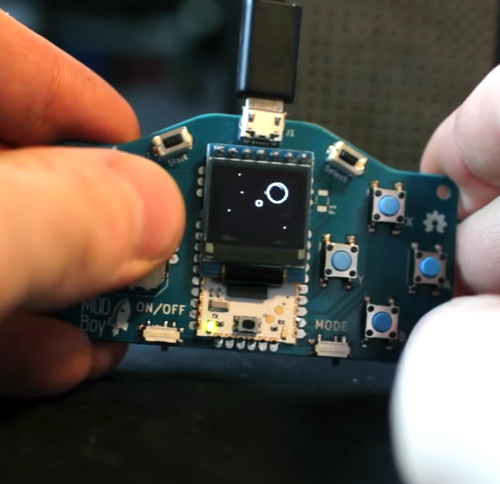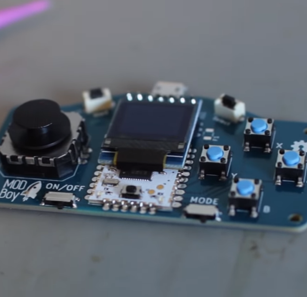 Now that the board has the HCC microcontroller solderd, he also placed an OLED screen, some push buttons, switches and a joystick with X and Y directions. The baord also has space for some sliding switches for mode select and to power on and off the baord. On top, the baord has a USB connector so you could plug it to the PC and on the back, it has space for a batter so it could be portable. It has a very nice design, and the shape of an old console controller.
