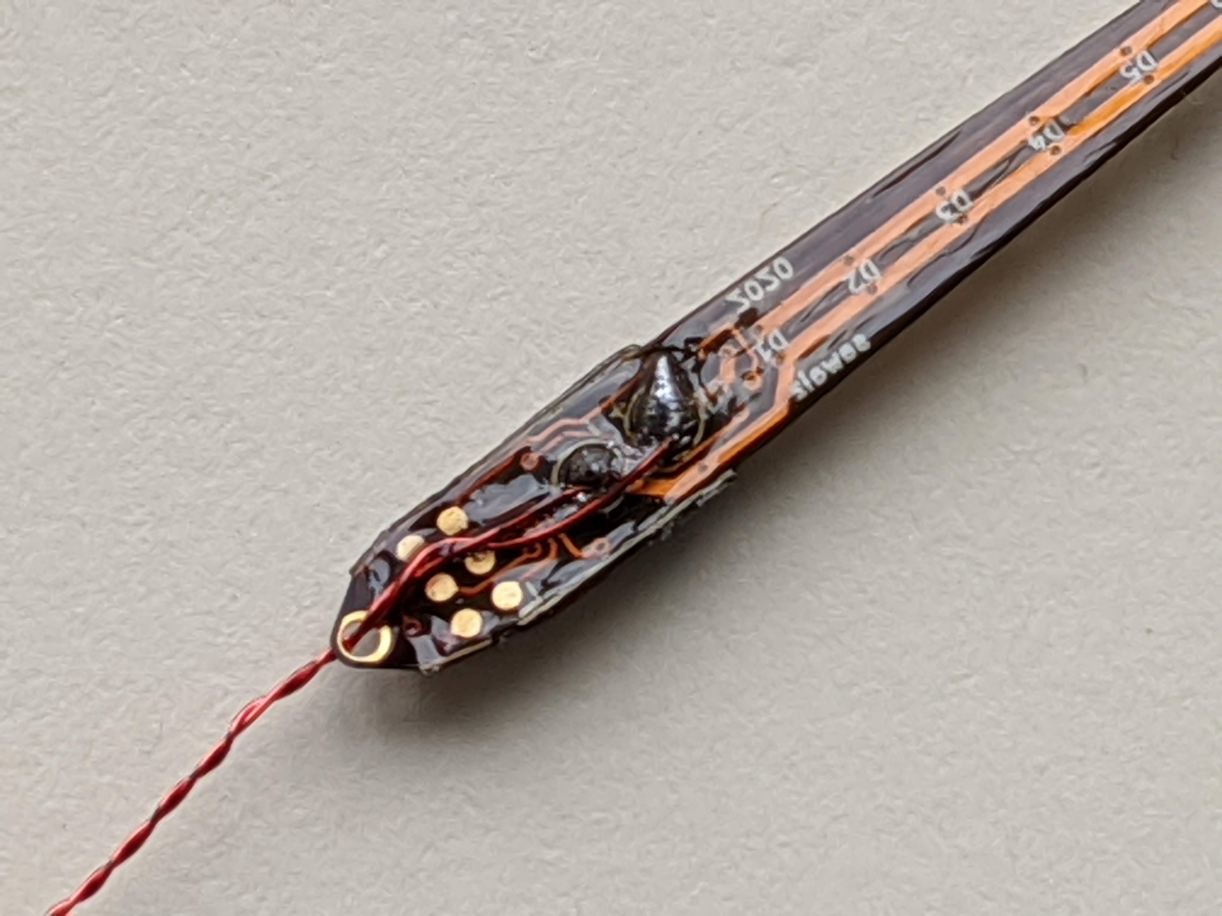 Assembly is all surface mount with components on one side of the board to make PNP assembly easy. The layout layer duplicated below lists components by their reference designators and values. Solder paste can be applied with 25ga+ syringe, or with a stencil of the top paste layer. The components can then be placed, taking note of those that are polarity dependent, being U1-U3 and D1-D8 as marked in the assembly layer. A standard reflow profile, a hotplate, or a hot air rework station should work equally well. Inspect the side joints of the microcontroller as they will experience a lot of stress when trimming the board. The board is a two-layer polyimide flex with 6/6mil spacing, plated through vias. These are generally the defaults boards so they can be made by most fabrication houses provided flex is an available option.