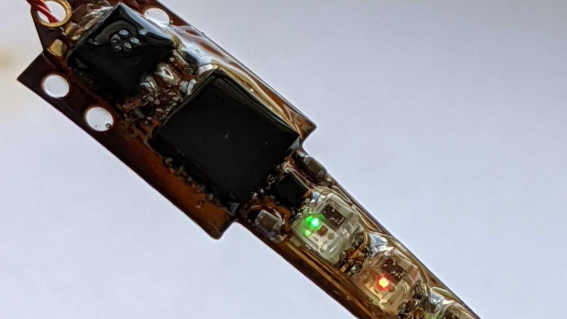 Microchip's MIC5365 and battery pads are the main power components. The 3.3V LDO linear regulator provides power to the microcontroller and IMU. There is no UVLO so it is recommended your battery has one. With voltage below 3.3V the output voltage corresponds to the input with the ~60mA drop, the board should continue working until 2.7V where the blue diode will cut out and the microcontroller falls out of it's speed grade and may not be able to maintain its clock speed. The two battery pads on the back are marked with plus and minus symbols and can have enameled wires soldered to them to provide power to the board.