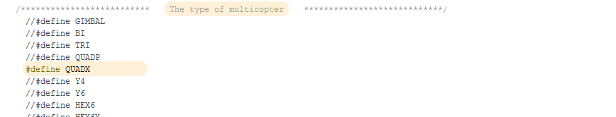 To activate any configuration you should only delete the double slash line that comments that part of the code. The type of the drone that I’m building is a quad X with 4 motors positioned in a shape of an X. Now let’s scroll down a little bit more.
