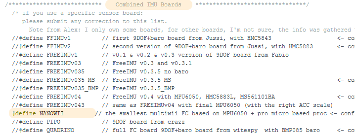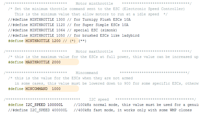 Here we define the minimum throttle. To control the motors, we have to send a PWM signal to the esc. The PWM is modulated by changing the pulse width of the signal. This width is measured in micro seconds. The motors that I’m using have a throttle range from 1000 us to 2000us where 1000 is no speed at all and 2000 is full throttle. I like to live my drone on 1150 or 1200 minimum throttle because that will ensure me that I’ll have no motors delay when I start flying my drone. That would also mean that the motors will spin at low RPM while in the stand by mode. Ok I live the maximum throttle at 2000. The minimum command is the minimum range that the radio controller could send. In this case, it will be 1000 us. We will se this when we will build the radio controller. Now scroll down to the IMU boards.