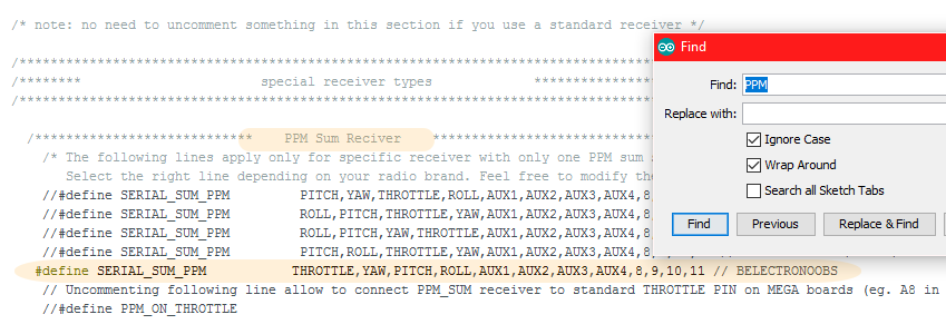 I’ll uncomment one that has the MPU 60 50 module. I select the NANOwii board since this one is for Arduino anno with a MPU6050 board. The next step is to establish a PPM communication between the radio controller receiver and the flight controller. The receiver that we will build will send an 8 channel PPM signal with the values for the throttle, yaw, pitch and roll. For that type control F to open the find tab. Now type PPM and click search.