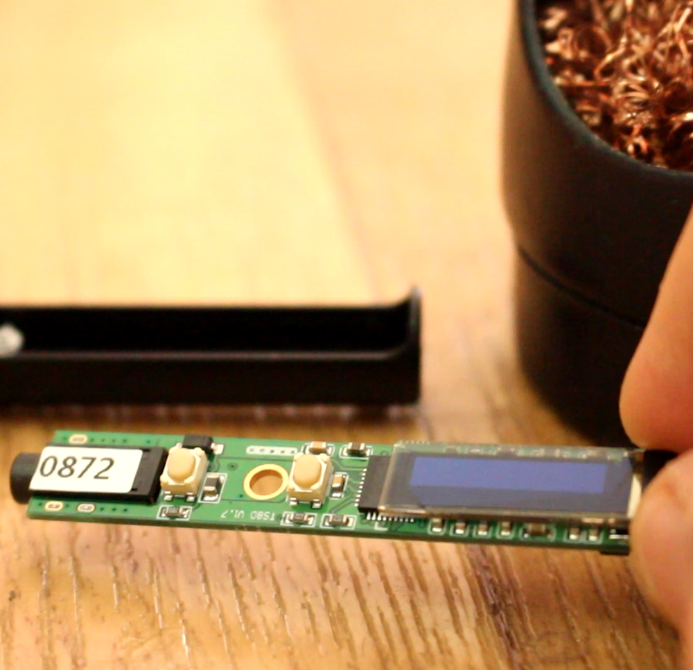 Inside, we have a very small PCB, very, very, small. On the top, we haev the OLED screen, push buttons for control andthe STM32 microcontroller. There is also a small chip that might be the accelerometer that would detect the sleep mode.