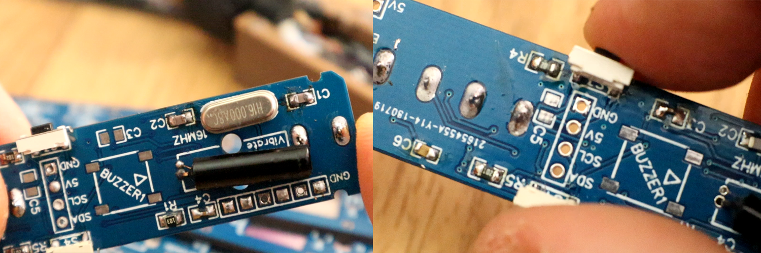 With the vibration sensor, the board could get out of sleep mode when the soldering iron moves, so that's a nice touch. Also, now the push buttons are placed on the sides, so he had to use 90 degrees push buttons that are used to increase and decrease temperature, and also turn on adn off the Sleep mode.