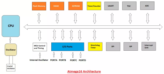 The CPU serves as the central processing unit, functioning akin to the controller's brain, overseeing the execution of numerous instructions. It manages interrupts, conducts calculations, and orchestrates peripheral control through its registers. Within Atmega16, it interfaces with two distinct buses: the instruction bus for reading instructions, and the data bus for accessing or modifying corresponding data. Key components of the CPU include the program counter, general-purpose registers, stack pointer, instruction register, and instruction decoder.