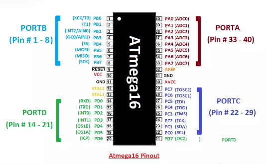 Atmega16 represents a 40-pin microcontroller engineered using CMOS technology, renowned for its low power consumption and robust noise immunity. This 8-bit marvel operates on AVR's advanced RISC architecture, a lineage of microcontrollers pioneered by Atmel back in 1996. It encapsulates a full-fledged computing unit featuring CPU, ROM, RAM, EEPROM, timers, counters, ADC, and four 8-bit ports designated as PORTA, PORTB, PORTC, and PORTD, each hosting 8 I/O pins.