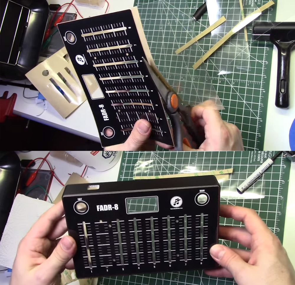 He first designed the front panel and printed it on a sheet of paper then laminated in plastic. After he made the metal case, he glued the fron panel design and cut the excess. He also printed some personal amde knobs for the sliders. The PCB gets screwed inside the case and the 7-segment display will be exactly in the middle. Add the knobs, buttons, progrm the Arduino to work with MIDI control and the MIDI box is ready. For more, check his channel on Noteas and Volts.