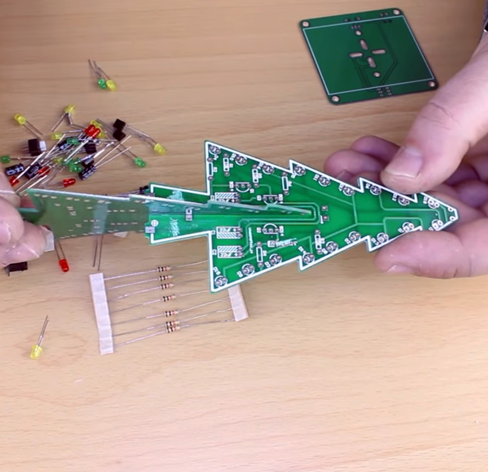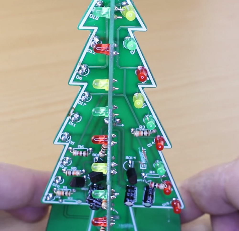 Hacktuber YouTube channel presented his work on a Christmass tree PCB with small LEDs taht blink. The circuit is more than basic and the entire project is amde out of 2 vertical boards in a shape of a Christmas tree and one horizontal PCB taht will eb the base. There is a soldered connection ebtween these boards that arrive in the shape of a KIT so you could mount it at home. On the vertical PCBs we can see a lot of LEDs of different colours but also some resistors, a few transistors and capacitors taht will create the blink effect.