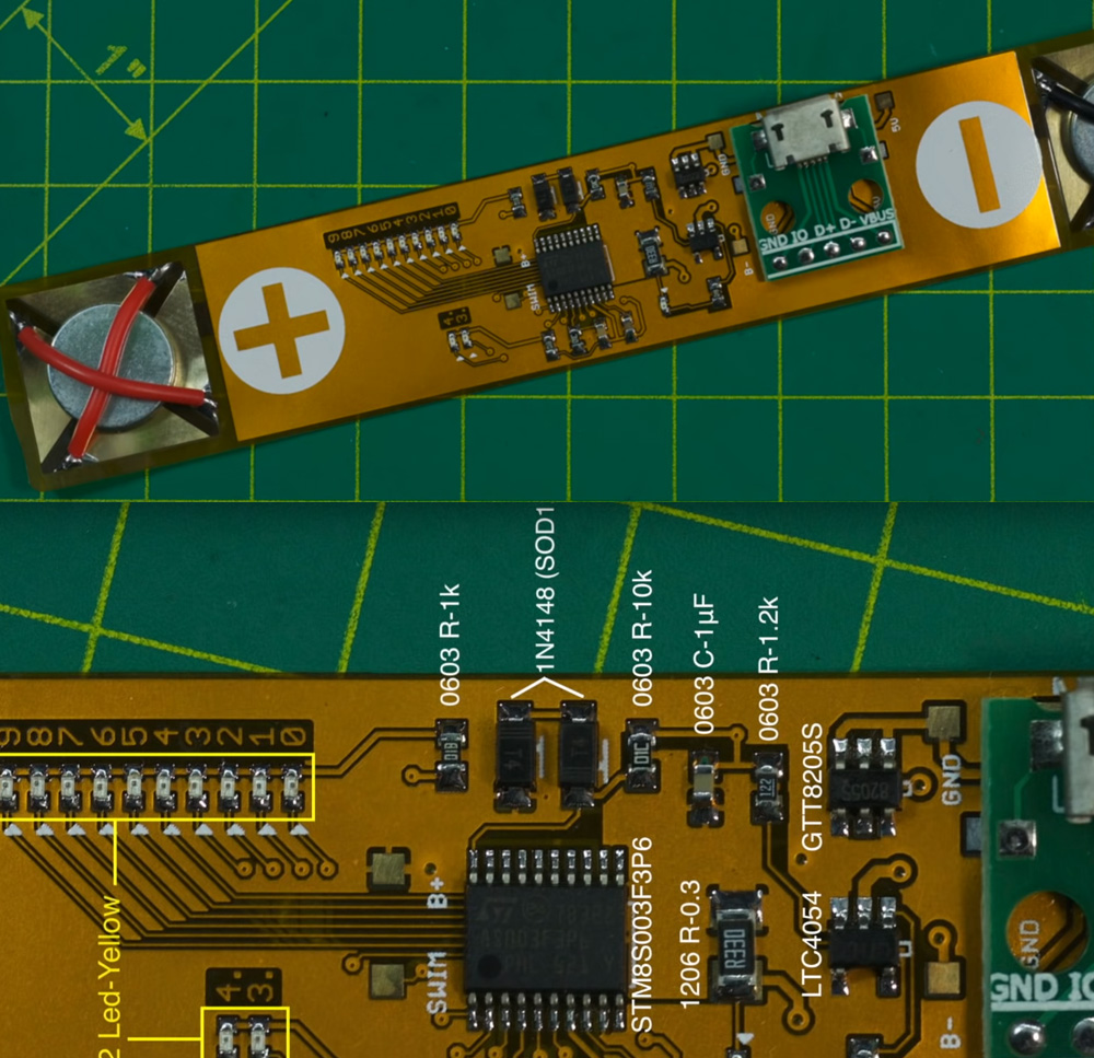 To charge the battery and add protection, he used the LTC4054 and the GTT8205S chips with a few more resistors and capacitors. It also has a small USB pcb with a mini USB connector used to charge the battery with any 5V USB cable. To show the voltage the baor has 2 LEDs on the left side and 10 on the other side. When the 3. LED is blinking, that indicates a voltage value of 2. With 3. LED always on we haev 3 volts and when 4. LED is on we haev 4 volts. Each of these valeus plus the valeus shown by the LEDs on the right side. If the microcontrolle had one extra digital pin, he could used 3 LEDs for the ones and the other LEDs for the tenths.Unfortunelly, all pins are used so he had to blink one instead of always on.