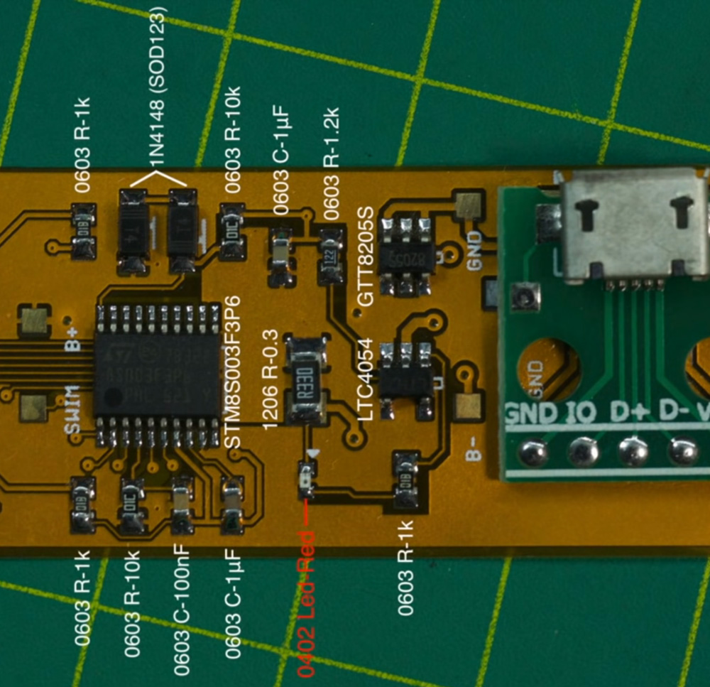 The design is quite simple. Around the charging circuit there is an STM8 microcontroller used to read the analog value and then turn on a few LEDs and by that show the voltage with a precision of 100mV.