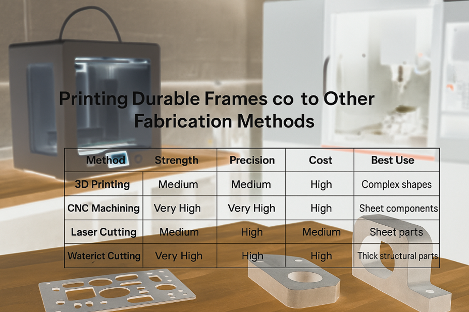 3D printing competes with machining, laser cutting, and waterjet cutting. Machining offers metal strength and tighter tolerances. Laser cutting handles sheet materials quickly. Waterjet cutting is well-suited to thick, strong materials. Each method serves a different structural role.