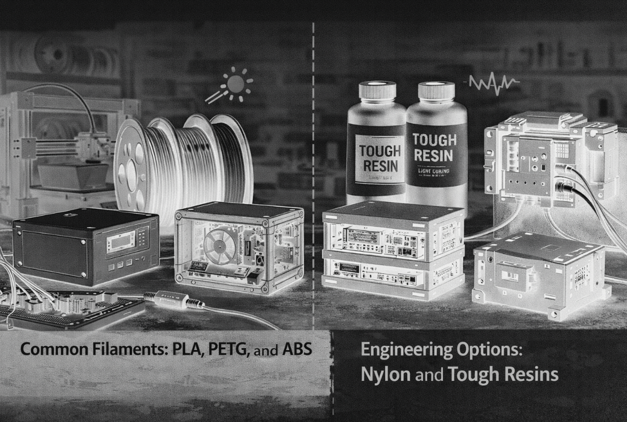 3D printing materials are plastics or resins that form the enclosure, and they determine heat resistance and toughness.