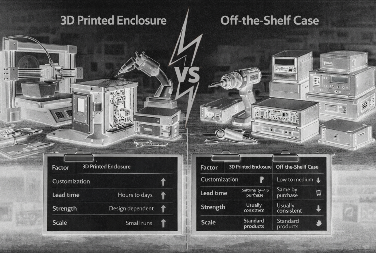 3D printed enclosures win on customization, while off-the-shelf cases win on immediate availability and consistent material ratings.