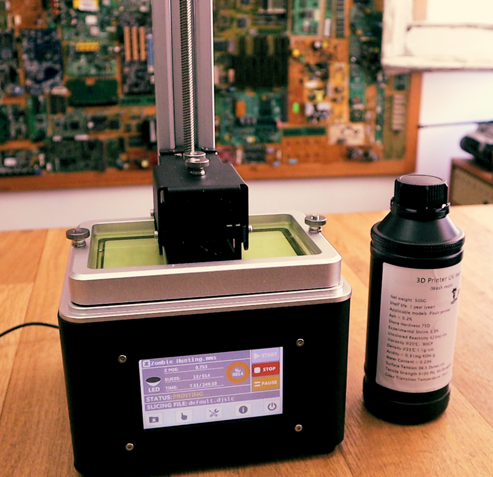 A different type of 3D printer are SLA printers. SLA stands for stereolithography and these machines use a light sensible resin that hardens while exposed to light. usually UV light. A laser with high precision passes and hardens each layer. These printers are very expensive, at least 1500€.
