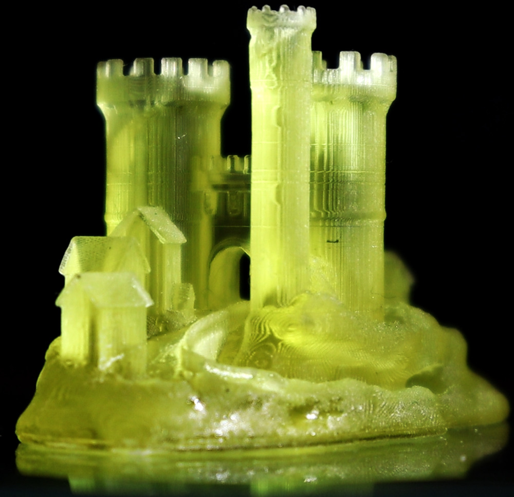 Here we start with some printed examples. Here is the castle downlaoded from Thingeverse. The amount of detail is amazing. The object is around only 3cm height. The windows of the castle can be seen, and even the small inside stairs of the towers. The printing time for this object was around 2 hours. But not because the speed of DLP printer is lower but because the precision is higher so with a layer height of 0.05 or lower, we haev more layers to print.