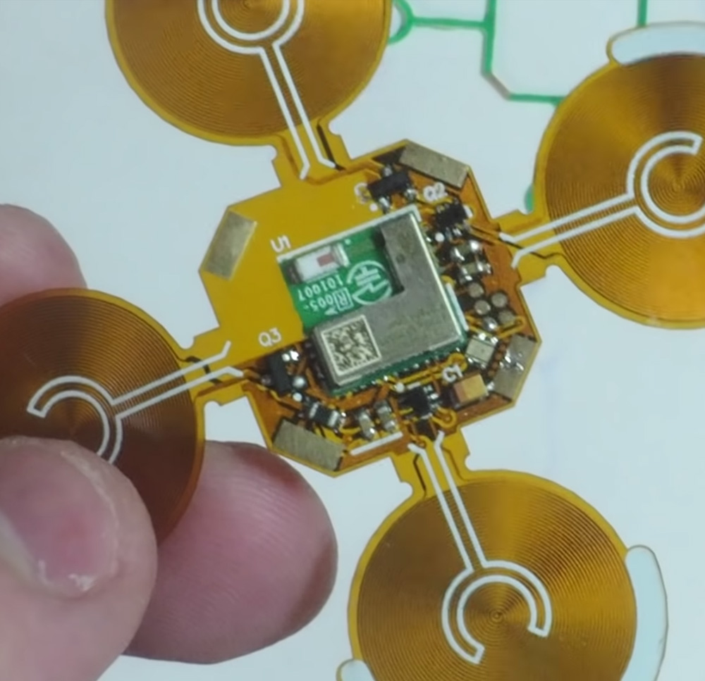 I, personally, was waiting for this project for some time. I saw his work a few months ago. Carl Bugeja is behind this idea and he first designed the coil legs. Running current through these coils and having a magnet below, it will make the leg to vibrate and by switching multiple legs, you could make the robot move. Now, he finally placed a Bluetooth receiver on top of the flexible PCB and this BT module is also a microcontroller so it could be programmed. He made a few tests where he oscillates the ooils at different frequencies and see the results. The main problem he had was the weight of the battery. He had a small battery but the current discharge of that was too low. The weight in this type of project is crucial.