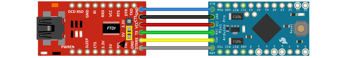 Primero de todo necesitamos alimentar el Arduino conectando Vcc del módulo FTDI al Vcc de 5 voltios del arduino. También conectaremos el GND con cualquiera de los GND del microcontrolador. Ya tenemos alimentado el Arduino. Si usais un arduino pro mini aqui tenéis la conexión con el modulo FTDI para poder programar el microcontrolador: