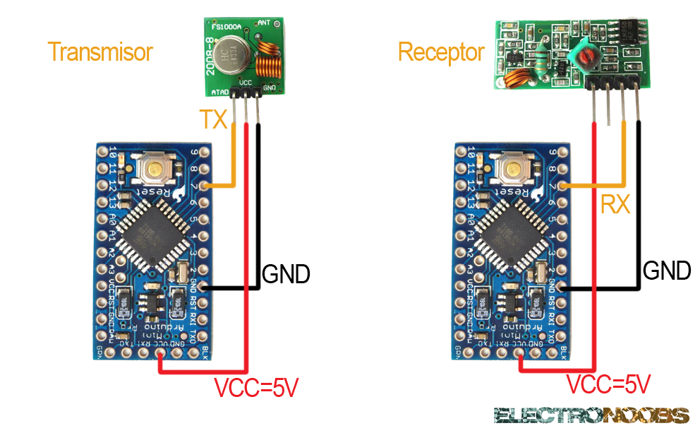 Queremos una comunicación radio entre dos arduinos. Estos dos módulos muy baratos nos serán útiles para pequeños proyector que necesiten corto alcance ya que el rango maximo de funcionamiento de estos modulos no supera los 20m. Son muy faciles de usar y conectar. Solo necesitan alimentación y un solo cable de datos. La desventaja es que solo podemos enviar un bit a la vez. Pero para crear por ejemplo un mando a distancia para su robot (ver galería) sería perfecto si solo usamos estados altos y bajos de los botones.