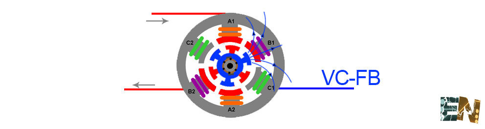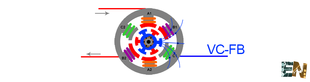 We observe in the above figure that the upper gate of the A output and the lower gate of the B are activated. That creates a curent flow from A to B coils in the direction of thee grey arrows. This current flow creates a equal magnetic field in bowth A and B coils. That magnetic field will push the oposite magnetic field of the exterior magnets rotating the motor. In this example we call the red color of the magnets south polarized and the blue ones north polarized. We obserbe blue arrows getting out of the blue magnet. Let's look at the C coil for now. Those field lines are not crossing the C coil yet. We can see that almost all the field lines are out of the coil but in the next figure, a few moments after we can see that there are a few lines crossing the coil. In this way the created current flow it is afected by the rotation of the motor. This gives us a voltage change VC-FB which we can measure with our microcontroller ADC. As the field lines are geting more perpendicular to the coil, the current flow is higher each time and so it's the voltage drop.