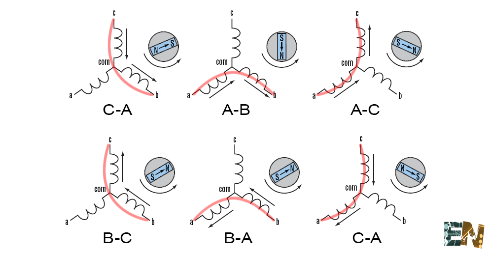 To understand better the inner function of a three-phase brushless motor we look at the figure above. We know that the motor has a multiple of 3 number of coils. The coils are distributed equidistantly around The perimeter of the motor. In this way between each coil there will be 360 degrees divided by the number of coils. In our case the engine is 12 coils, 4 coils for each of the 3 inputs. In the above figure those are represented by only one coil for each input. The moving part of the motor can be external or internal shaft , in this case is external. Around the movable part we need to place some strong magnets in the same way as the 12 coils, equally spaced. We know that applying a current flow through the coils, a magnetic field is created depending of the current flow direction. Alternating the current flow direction through the coils, we alternate the polarity of the electromagnetic field created in souch a way that we'll have opposite poles between the coils and magnets in certain points of time. Looking at the figure we can see that we start switching the upper "C" gate and the lower "A" gate. In this way we make current flow from C to A, creating a magnetic field through the two coils. That created field is opposite to the magnets field and that creates a push force which move forward the interval axis (360/12 degrees). Just at the moment when the coils pass through one each other middle, the next magnet have to switch to the next state so we have to make current flow from A to B and so forth creating an infinite loop that repeats every 6 states.