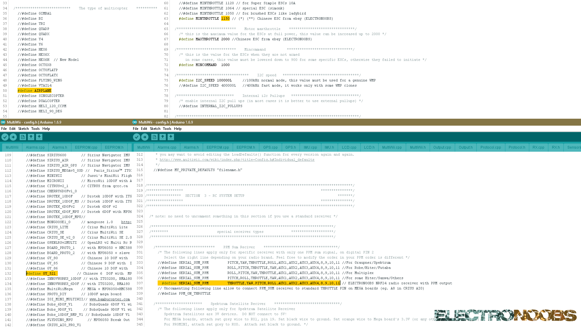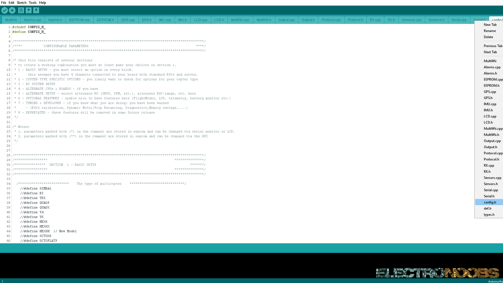 Now we have to program the flight controller. We will use a platform named Multiwii. Download the Multiwii.zip file below. Unzip the file. There you will find the source code for the flight controller and the JAVA Multiwii platform for 32b and 54b windows. Once you've unziped the file, open Arduino IDE and open the multiwii.ino file from the multiwii source code. This will open a lot of libraries. Go to config.h. There is where we will set all the configurations of outr flying machine.